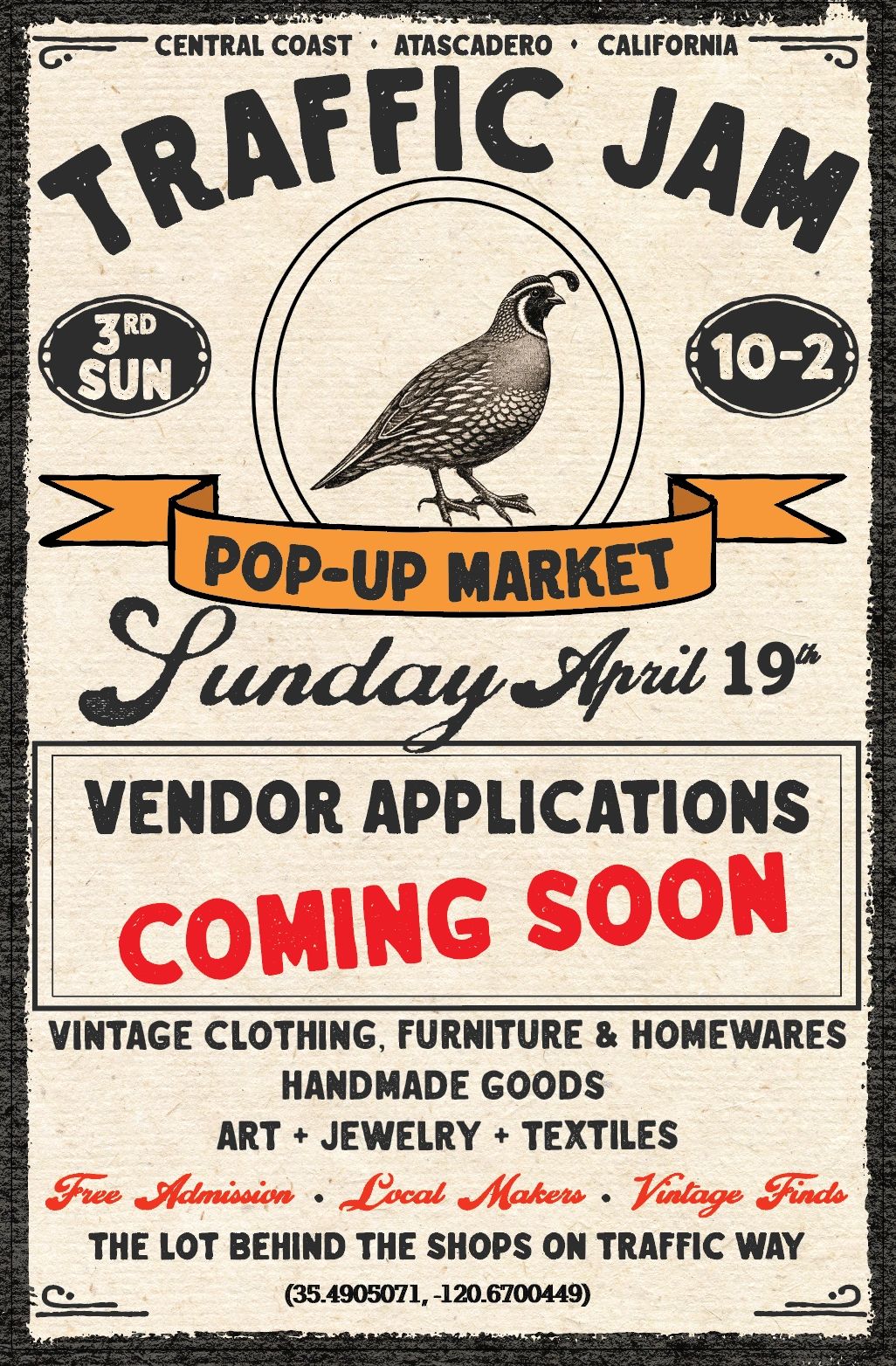 Traffic Jam is a curated market celebrating vintage goods, independent makers, and creative small businesses on California’s Central Coast. We love well-curated vintage collections alongside artists and makers producing original handmade work. Join us in downtown Atascadero for a lively market full of great finds, great vendors, and a great community.